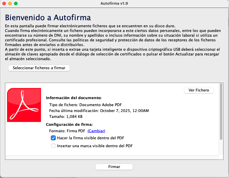 - Asinao co teu certificado dixital. Pódelo facer, por exemplo con «Autofirma» e guardalo no teu dispositivo. Terás que abrir Autofirma e seleccionar o ficheiro PDF que editaches cos teus datos