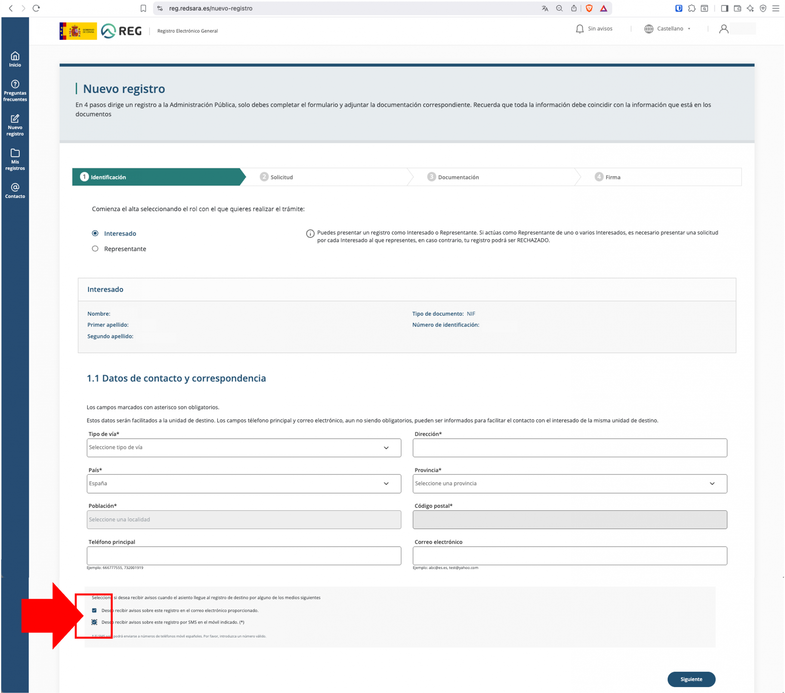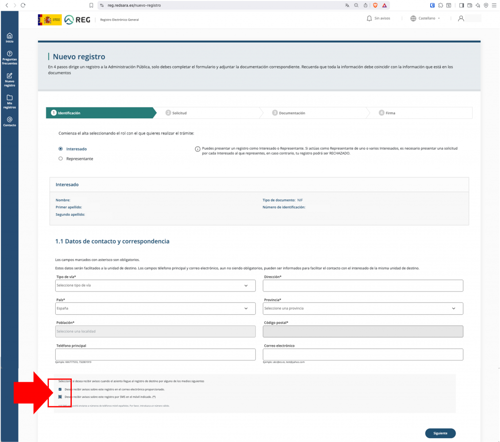 - Identificación: Completar a información requerida (dirección, teléfono e correo electrónico) e seleccionar a maneira que nos interesa para las notificacións (cómo queremos que nos manden a resposta)